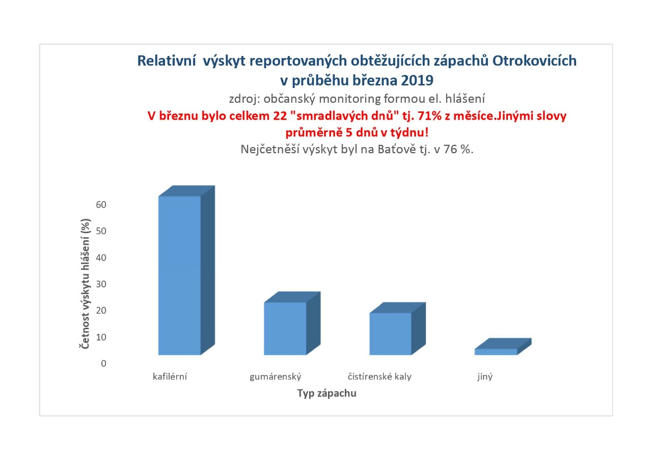 Počet hlášení o výskytu obtěžujícího zápachu se v březnu zvýšil oproti lednu 4x! Vyhodnocení výskytu jednotlivých zápachů viz graf.